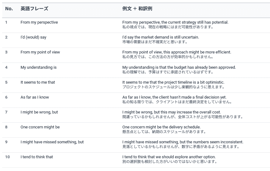 英語会議で意見を伝えるときに実際によく使われるものです。