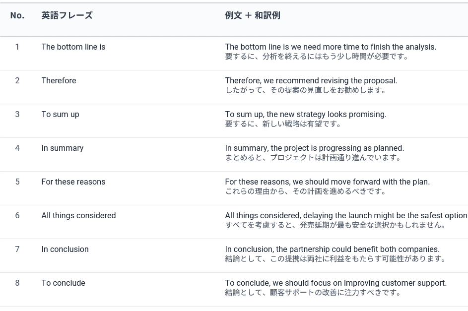 議論やプレゼンの最後に結論を示すときに使われる表現です。