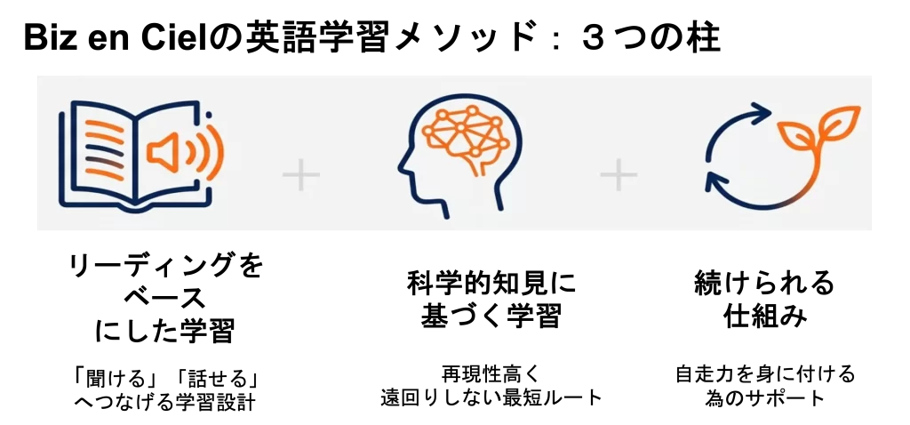 Biz en Cielは、科学的知見と実践に基づき「読む力」をベースとした学習メソッドを採用しています。読む力を鍛えることで理解のスピードと表現の幅が広がり、あなたの発信力につながっていきます。